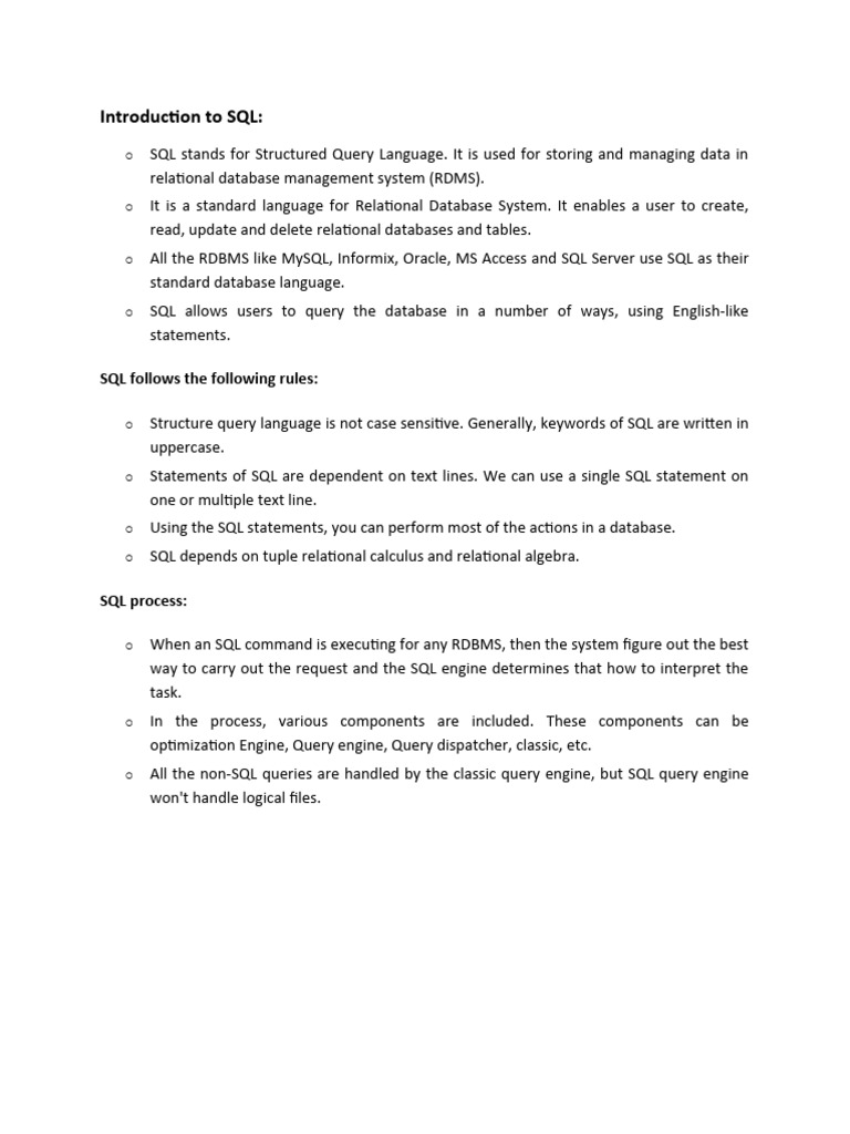 o All the RDBMS like MySQL, Informix, Oracle, MS Access and SQL Server use SQL as their