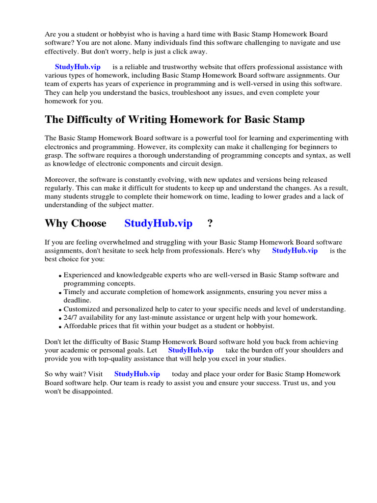 So why wait? Visit ⇒ StudyHub.vip ⇔ today and place your order for Basic Stamp Homework