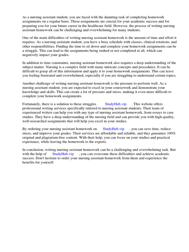 By ordering your nursing assistant homework on ⇒ StudyHub.vip ⇔, you can save time, reduce