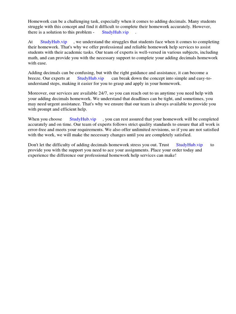 Don't let the difficulty of adding decimals homework stress you out. Trust ⇒ StudyHub.vip ⇔ to