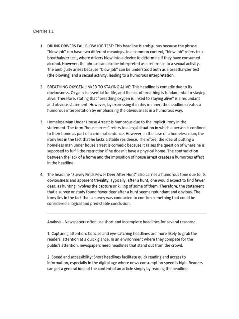 semantic ambiguities are used in the text, such as in newspaper headlines that omit words or have