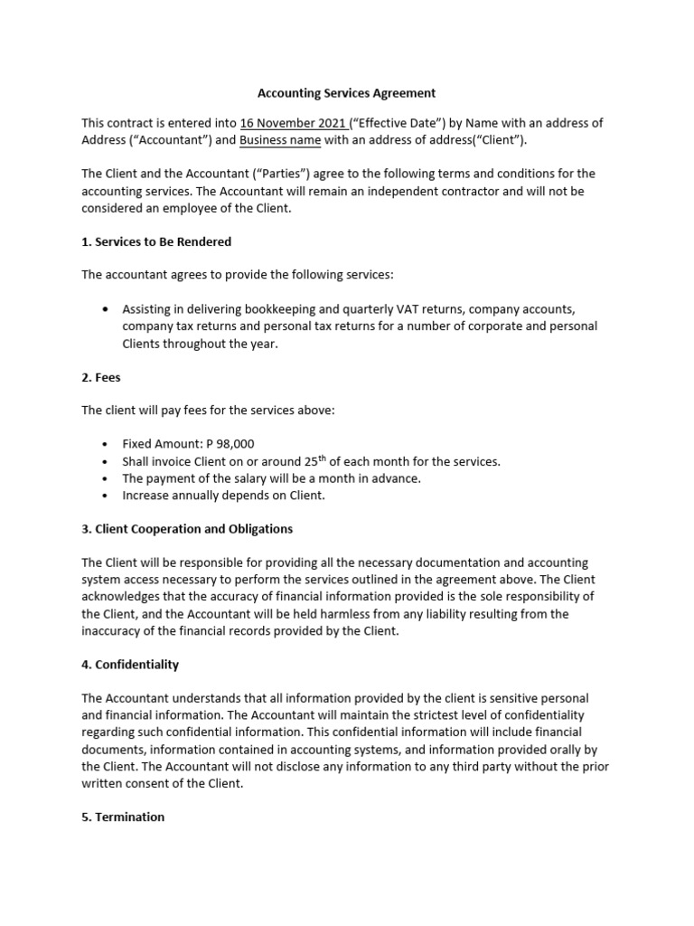 The Client and the Accountant (“Parties”) agree to the following terms and conditions for the