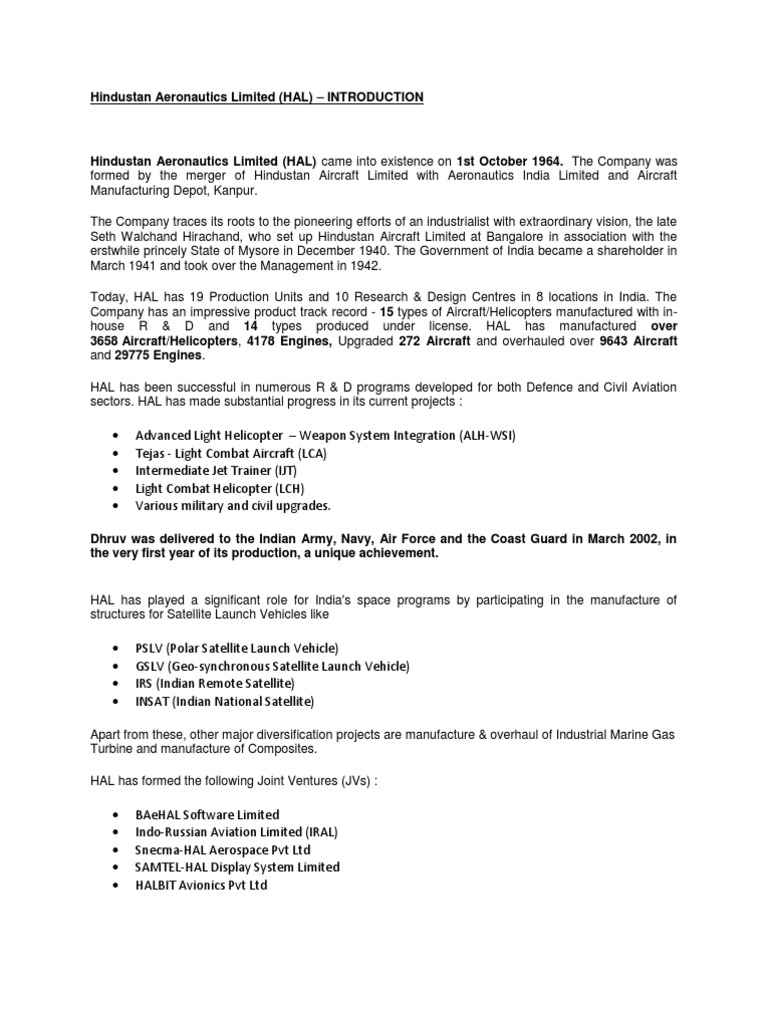 Hindustan Aeronautics Limited (HAL) INTRODUCTION