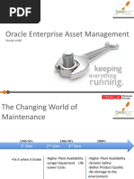 maintenance operations. It tracks the performance of the assets and rebuildable inventory items by using meters, quality plans and conditioning systems. 4) By effectively monitoring operational data such as maintenance history, performance trends, meter readings, and operating conditions, organizations can proactively manage available resources such as inventory, equipment and skilled personnel to match them to asset maintenance demand. 5) Optimization of asset utilizations, scheduling and resources improves resource efficiency and enhances maintenance quality, maximizes resource availability including equipment and labor. Maintenance costs and work history are tracked at asset level. 6) Oracle eAM enables organizations to create and implement optimal and effective asset management strategies that can increase revenue and decrease costs. Both Preventive and Predictive Maintenance strategies are supported by eAM. It allows you to create alternate maintenance strategies for seasonal or production capacity changes. It supports sophisticated, condition-based maintenance strategies for property, plants and public infrastructure, improves operation performance, and with preventive and scheduled maintenance, increases safety, optimizes Scheduling and resource efficiency. 7) It eliminates the need for spreadsheets and disparate data repositories, by enabling companies to manage reactive, planned, preventive maintenance, and adopt a centralized, proactive strategy for managing asset maintenance across an enterprise. 8) Oracle eAM's single-instance design ensures best practices and quality compliance globally, eliminates excess and obsolete spare parts inventories, promotes environmental, health and safety policies, smoothes coordination of production and maintenance schedules and improves both the responsiveness and accuracy of contracted maintenance. 9) It bridges the gap between ERP/MRP solutions and Asset Maintenance for industries that rely heavily on Asset Maintenance Systems. 10) It is a lynchpin of the integrated workplace incorporating visual navigation for space planning and allocation, multi-channel service request processing, building systems maintenance and technology asset tracking. 11) eAM improves return on capital assets by integrating physical with financial aspects and supporting deep collaboration between project lifecycle and service lifecycle operations. 12) It integrates seamlessly with other modules of E-Business suite and is suitable for Metals/Mining, Manufacturing, Pulp/ Paper, Petrochemicals, Facilities and Education and many more assets.
