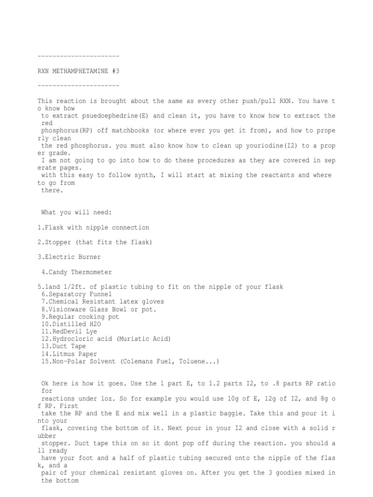 You have t o know how to extract psuedoephedrine(E) and clean it, you have to know how to extract the red phosphorus(RP) off matchbooks (or where ever you get it from), and how to prope rly clean the red phosphorus. you must also know how to clean up youriodine(I2) to a prop er grade. I am not going to go into how to do these procedures as they are covered in sep erate pages. with this easy to follow synth, I will start at mixing the reactants and where to go from there. What you will need: 1.Flask with nipple connection 2.Stopper (that fits the flask) 3.Electric Burner 4.Candy Thermometer 5.1and 1/2ft. of plastic tubing to fit on the nipple of your flask 6.Separatory Funnel 7.Chemical Resistant latex gloves 8.Visionware Glass Bowl or pot. 9.Regular cooking pot 10.Distilled H2O 11.RedDevil Lye 12.Hydrocloric acid (Muriatic Acid) 13.Duct Tape 14.Litmus Paper 15.Non-Polar Solvent (Colemans Fuel, Toluene...) Ok here is how it goes. Use the 1 part E, to 1.2 parts I2, to .8 parts RP ratio for reactions under 1oz. So for example you would use 10g of E, 12g of I2, and 8g o f RP. First take the RP and the E and mix well in a plastic baggie. Take this and pour it i nto your flask, covering the bottom of it. Next pour in your I2 and close with a solid r ubber stopper. Duct tape this on so it dont pop off during the reaction. you should a ll ready have your foot and a half of plastic tubing secured onto the nipple of the flas k, and a pair of your chemical resistant gloves on. After you get the 3 goodies mixed in the bottom