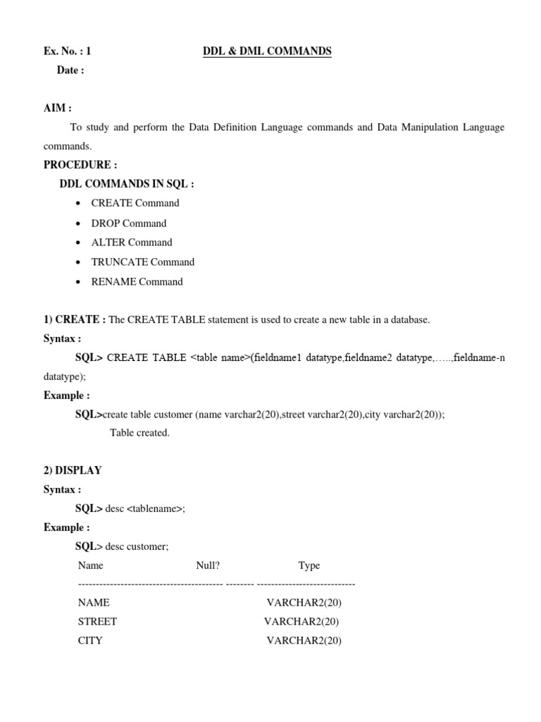 To study and perform the Data Definition Language commands and Data Manipulation Language