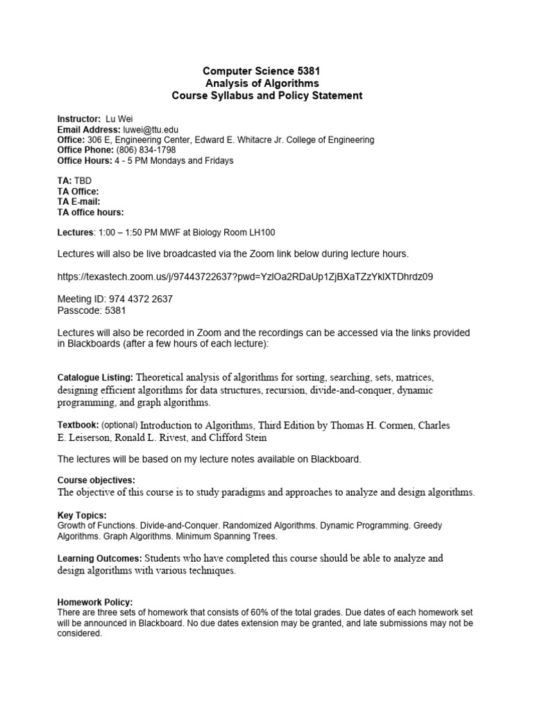 Textbook: (optional) Introductionto Algorithms, Third Edition by Thomas H. Cormen, Charles