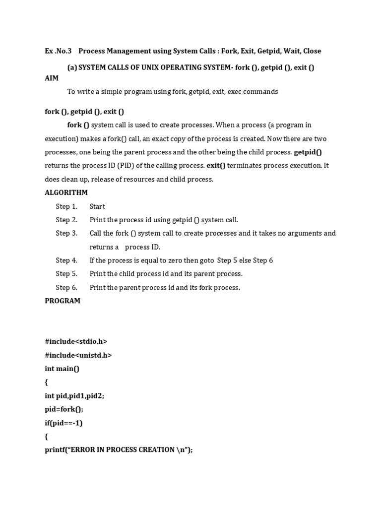 3 Process Management using System Calls : Fork, Exit, Getpid, Wait, Close