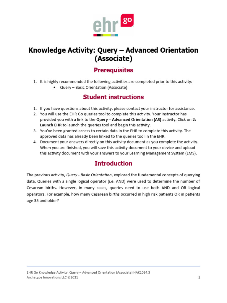 EHR Go Knowledge Activity: Query – Advanced Orientation (Associate) HAK1034.3