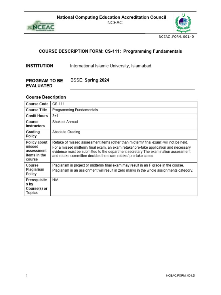 COURSE DESCRIPTION FORM: CS-111: Programming Fundamentals