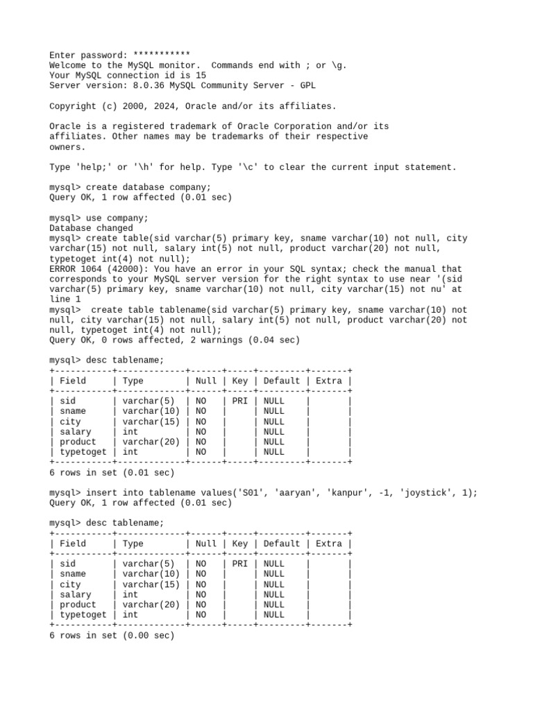 null, city varchar(15) not null, salary int(5) not null, product varchar(20) not