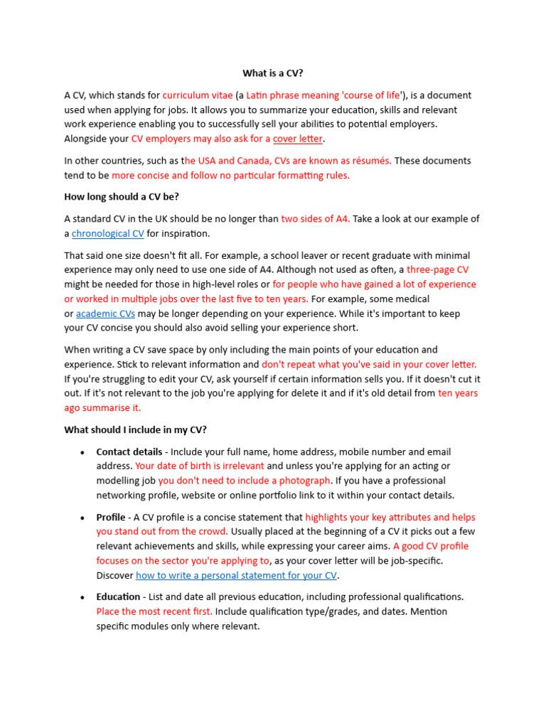 A standard CV in the UK should be no longer than two sides of A4. Take a look at our example of