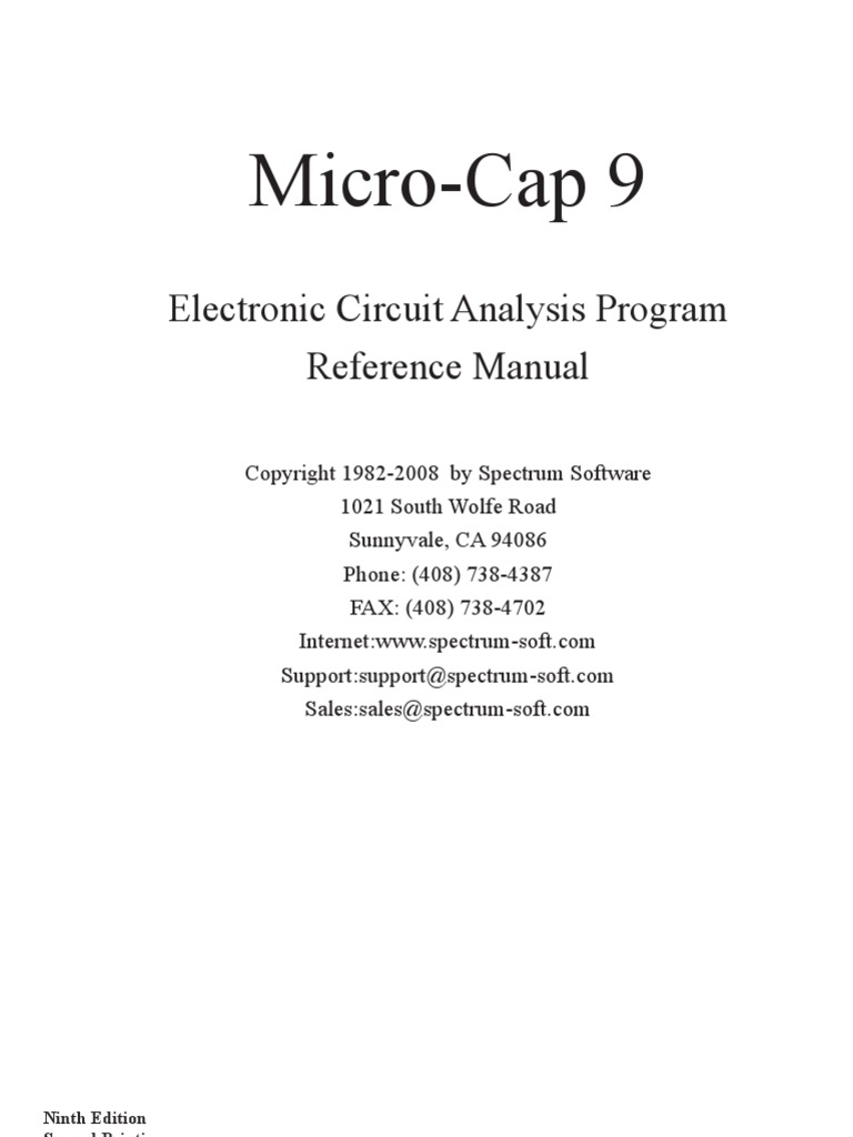 Ninth Edition Second Printing January 2008 Copyright Spectrum Software. 1982-2008. This manual and the software described in it are copyrighted, with all rights reserved. No part of this publication, or the software, may be reproduced, transmitted, transcribed, stored in a retrieval system, or translated into any language in any form without the written permission of Spectrum Software. Software license notice Your license agreement with Spectrum Software, which is included with the product, describes the uses of the software which are permitted and the uses which are prohibited. Any unauthorized duplication of Micro-Cap 9, in whole or in part, in print, or in any other retrieval or storage system is expressly forbidden.