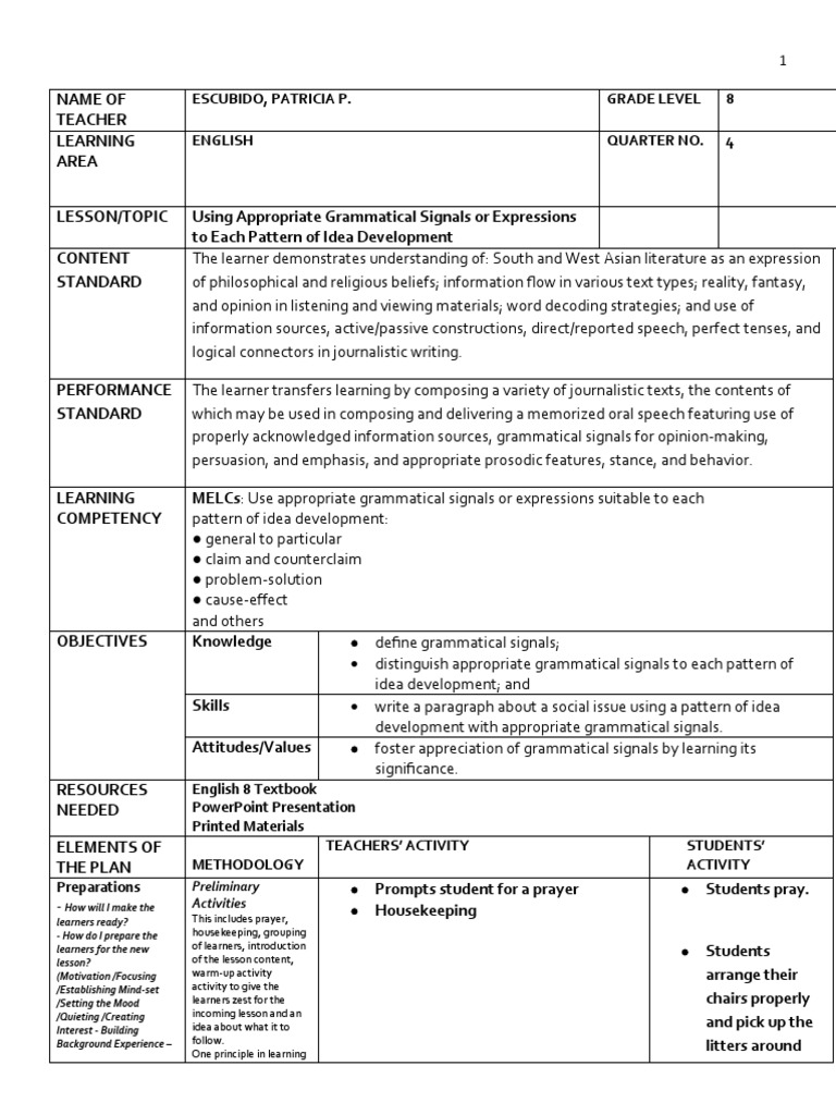 LESSON/TOPIC Using Appropriate Grammatical Signals or Expressions