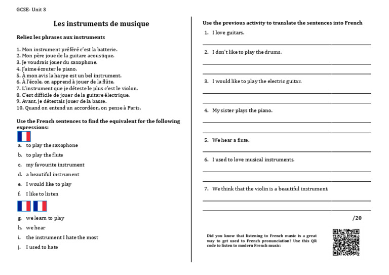 6. À l’école, on apprend à jouer de la flûte. 3. I would like to play the electric guitar.