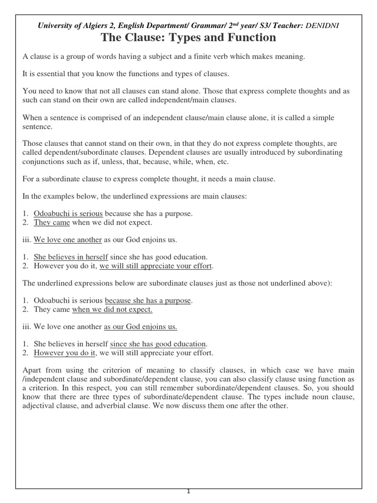 Apart from using the criterion of meaning to classify clauses, in which case we have main