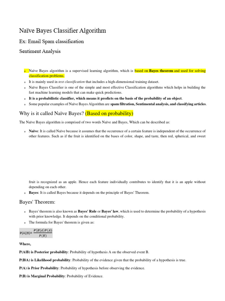 o Naïve: It is called Naïve because it assumes that the occurrence of a certain feature is independent of the occurrence of