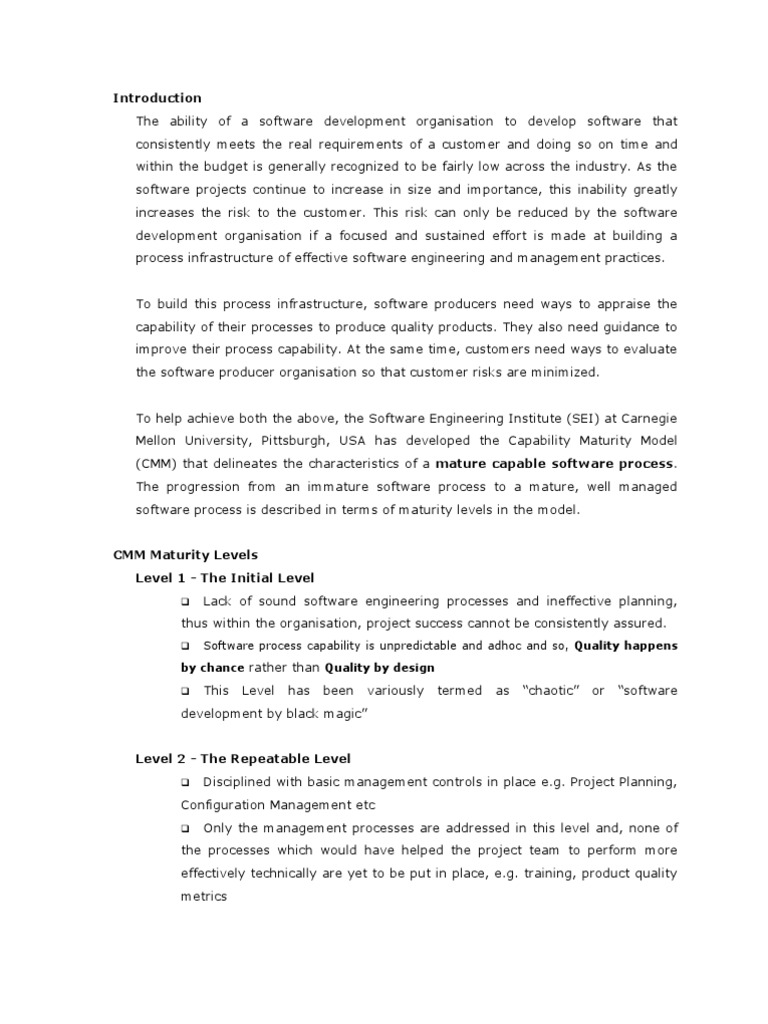 and doing so on time and within the budget is generally recognized to be fairly low across the industry. As the software projects continue to increase in size and importance, this inability greatly increases the risk to the customer. This risk can only be reduced by the software development organisation if a focused and sustained effort is made at building a process infrastructure of effective software engineering and management practices. To build this process infrastructure, software producers need ways to appraise the capability of their processes to produce quality products. They also need guidance to improve their process capability. At the same time, customers need ways to evaluate the software producer organisation so that customer risks are minimized. To help achieve both the above, the Software Engineering Institute (SEI) at Carnegie Mellon University, Pittsburgh, USA has developed the Capability Maturity Model (CMM) that delineates the characteristics of a mature capable software process. The progression from an immature software process to a mature, well managed software process is described in terms of maturity levels in the model. CMM Maturity Levels Level 1 - The Initial Level