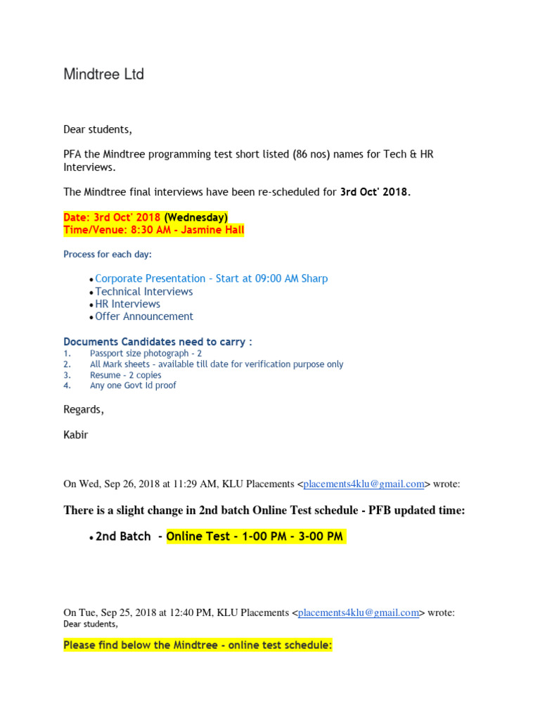 On Tue, Sep 25, 2018 at 12:40 PM, KLU Placements <placements4klu@gmail.com> wrote: