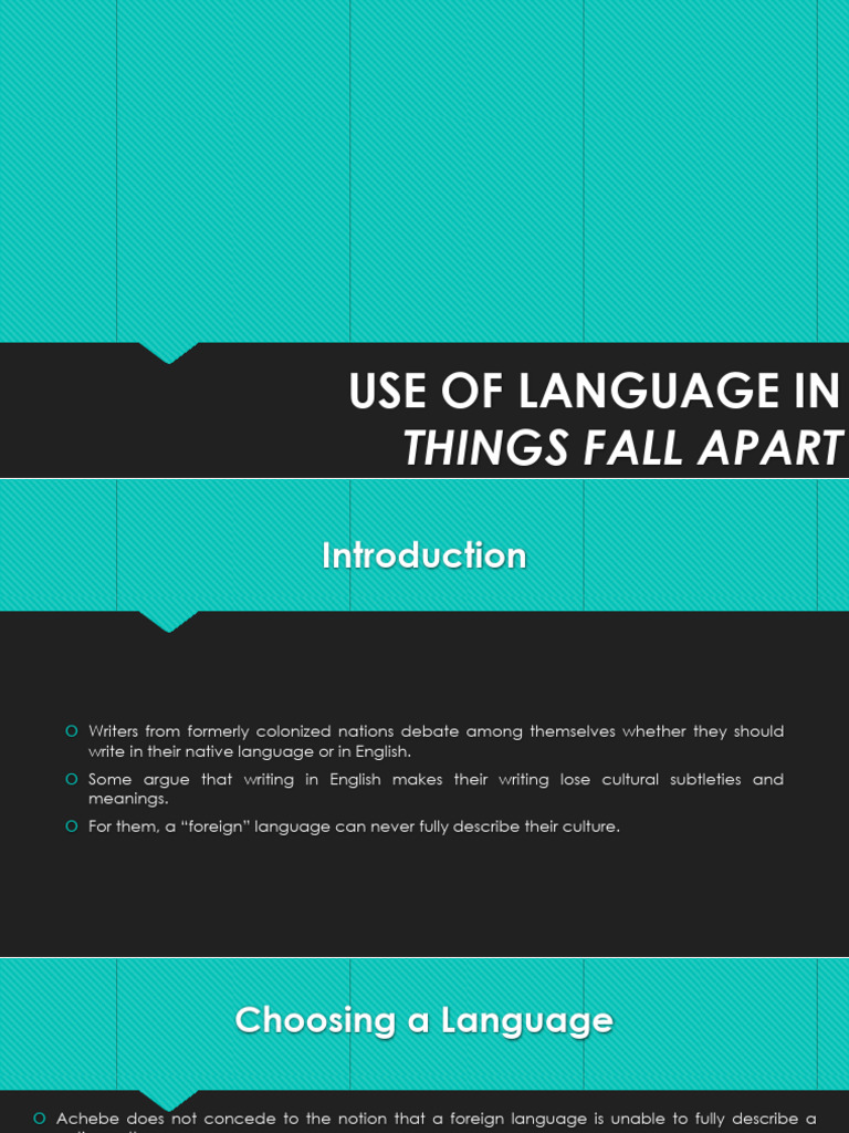 Achebe accomplishes this goal by innovatively introducing Igbo language, proverbs, metaphors,