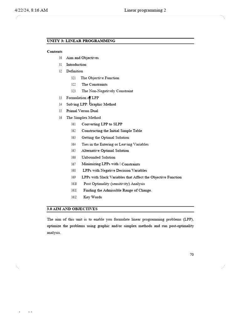 In this unit, you will be introduced to linear programming. Problems (LPP) First you will