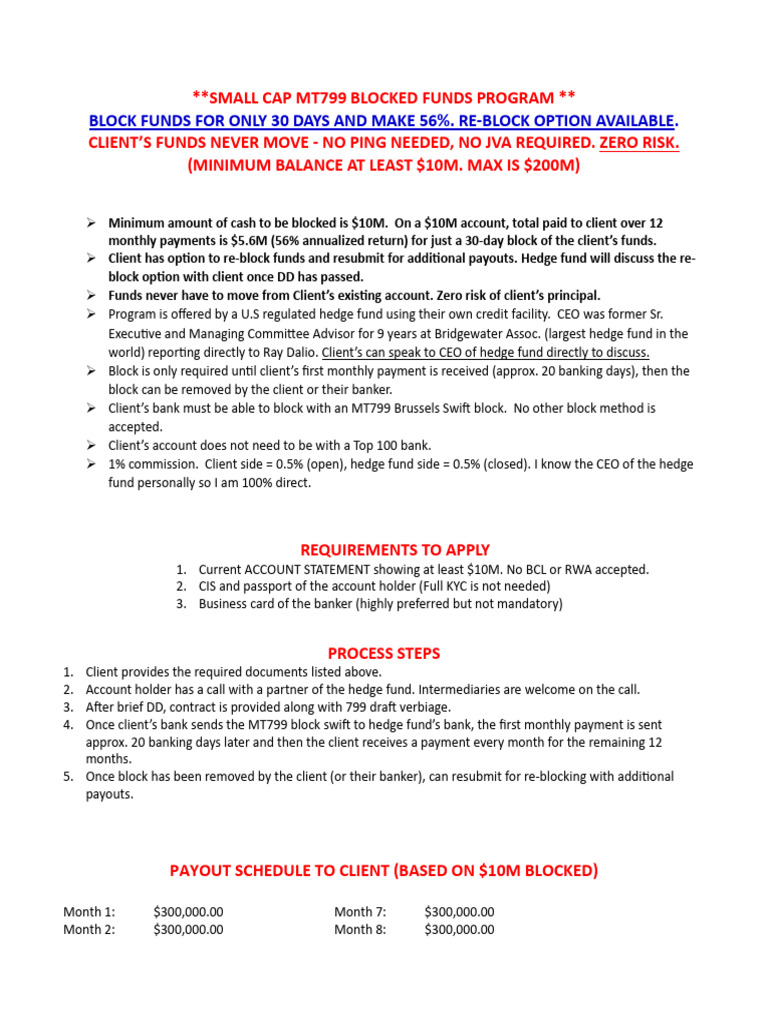 **SMALL CAP MT799 BLOCKED FUNDS PROGRAM **