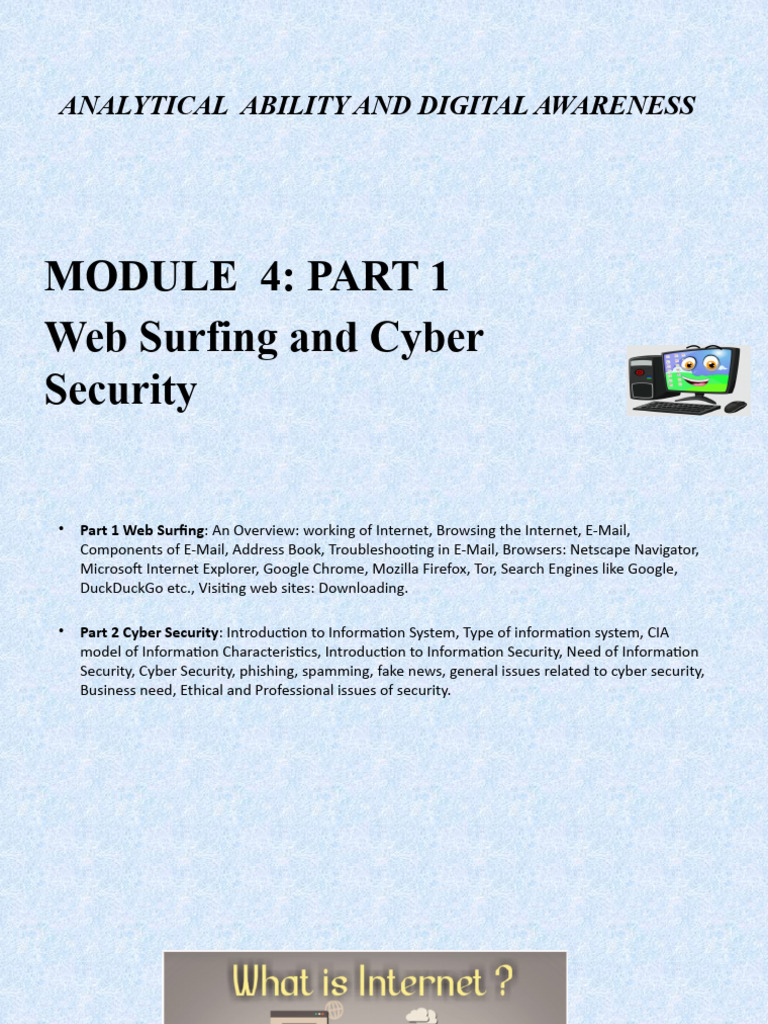 The document provides an overview of web surfing and cyber security. It discusses topics like how the internet works, browsing the internet, email components and troubleshooting, browsers, search engines, visiting websites, cyber security introduction, information system types, CIA model, information security need, phishing, spamming, fake news, business needs and ethical issues.