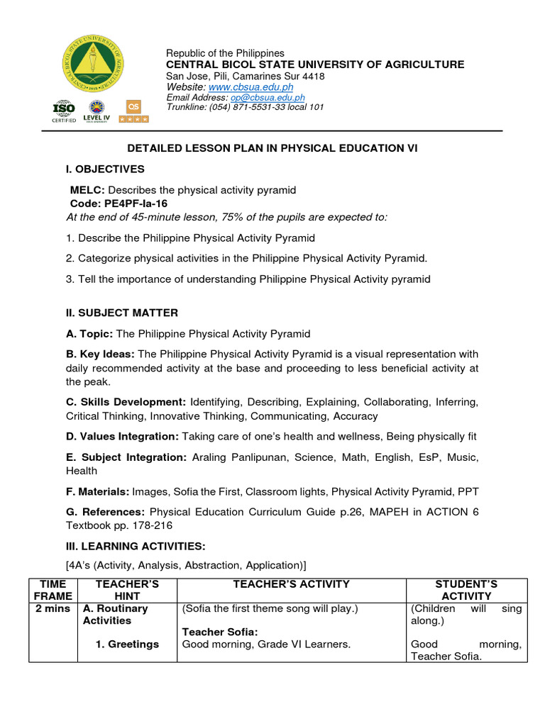 DETAILED LESSON PLAN IN PHYSICAL EDUCATION VI