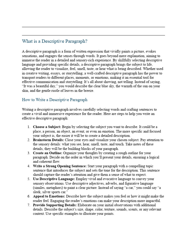 detailed description. Here’s a basic format to help you structure your descriptive paragraphs: