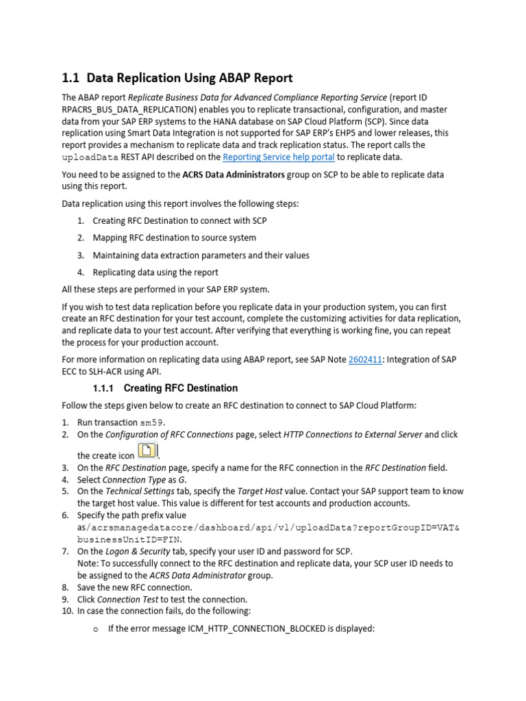 For more information on replicating data using ABAP report, see SAP Note 2602411: Integration of SAP