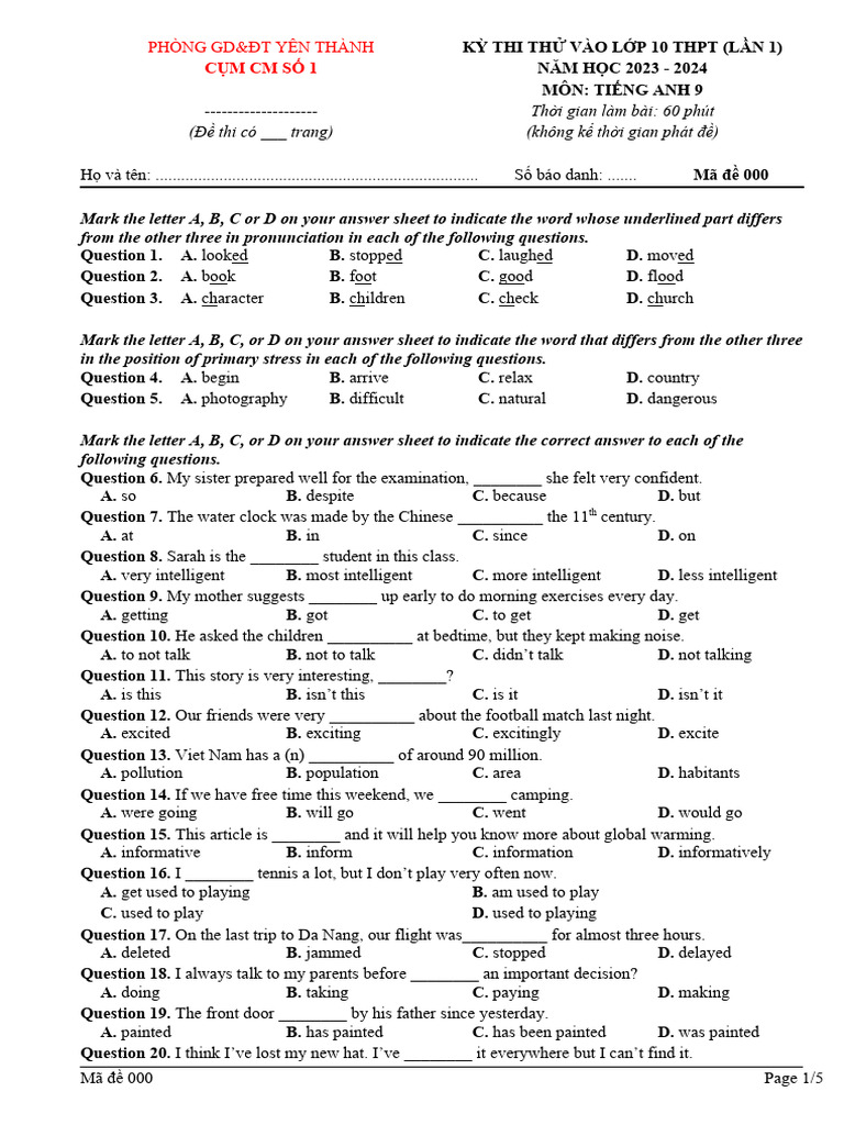 PHÒNG GD&ĐT YÊN THÀNH KỲ THI THỬ VÀO LỚP 10 THPT (LẦN 1)