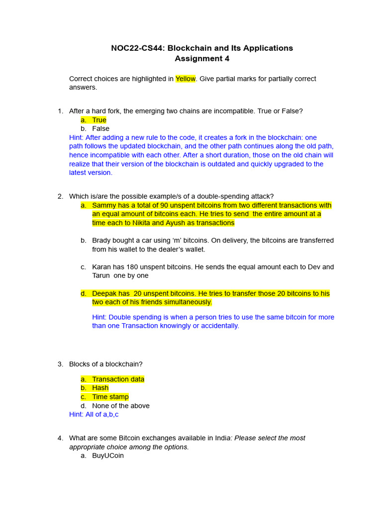 Correct choices are highlighted in Yellow. Give partial marks for partially correct