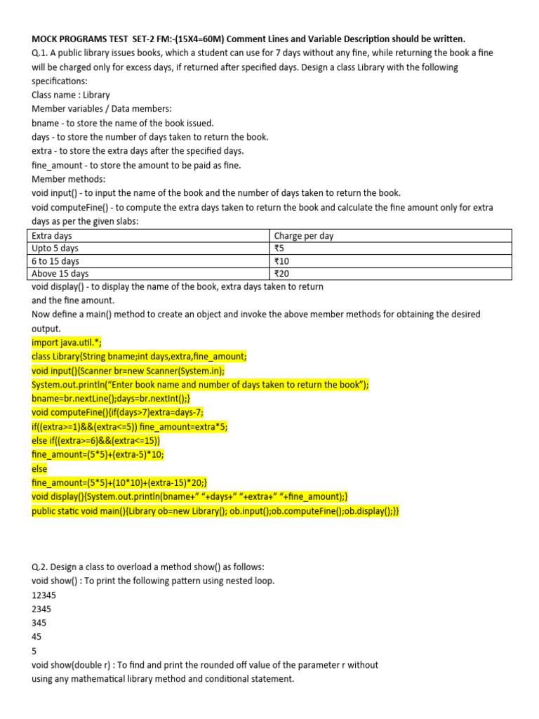 MOCK PROGRAMS TEST SET-2 FM:-(15X4=60M) Comment Lines and Variable Description should be written.