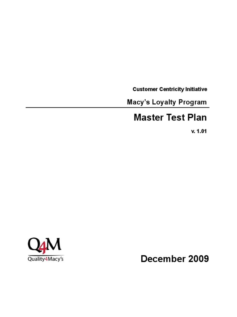 The purpose of this Master Test Plan is to describe the testing efforts for the Macys tender neutral loyalty program also known as the Customer Centricity Initiative (CCI) and the Macys Loyalty Program. The areas covered will include scope, approach, resources, and scheduling of testing activities across all testing phases.