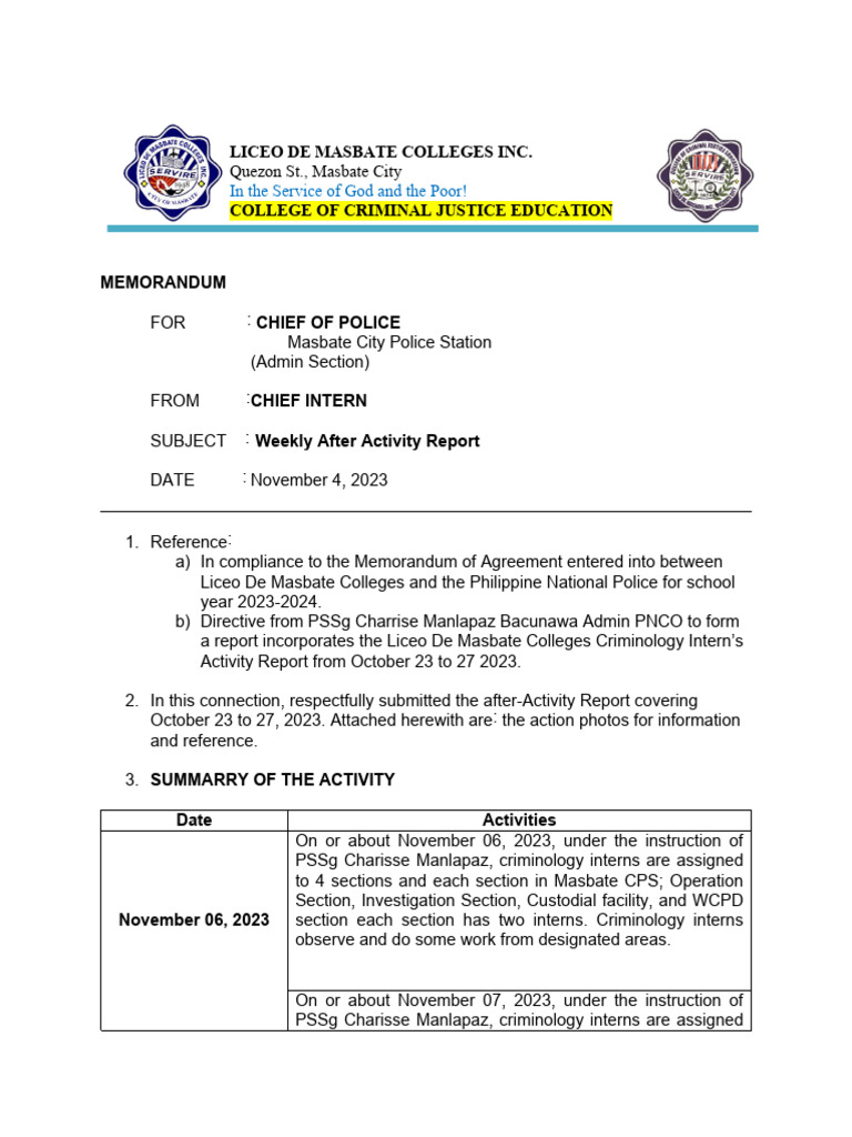 a report incorporates the Liceo De Masbate Colleges Criminology Intern’s