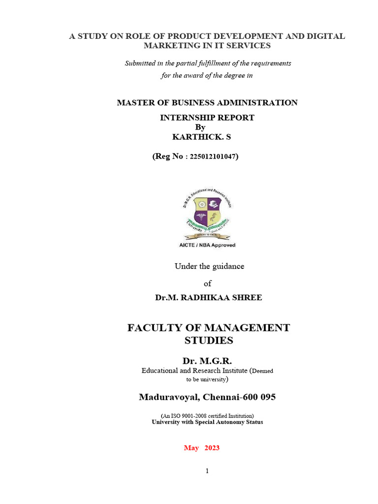 I KARTHICK. S (Reg. No) 225012101047 II year MBA student of Dr. M.G.R. Educational and