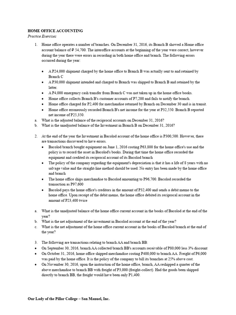 1. Home office operates a number of branches. On December 31, 2016, its Branch B showed a Home office