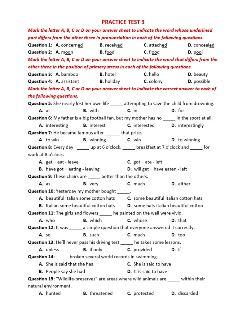 Mark the letter A, B, C or D on your answer sheet to indicate the correct answer to each of