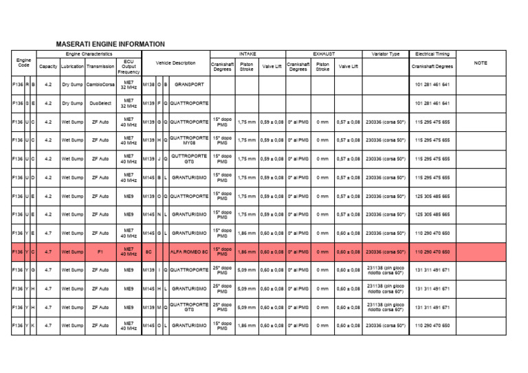 F136 Y E 4.7 Wet Sump ZF Auto M145 G L GRANTURISMO 1,86 mm 0,60 ± 0,08 0° al PMS 0 mm 0,60 ± 0,08 230336 (corsa 50°) 110 290 470 650