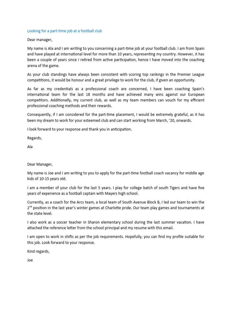 My name is Ala and I am writing to you concerning a part-time job at your football club. I am from Spain