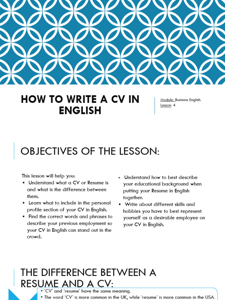 • The word ‘CV’ is more common in the UK, while ‘resume’ is more common in the USA.