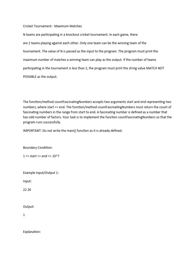 participating in the tournament is less than 2, the program must print the string value MATCH NOT