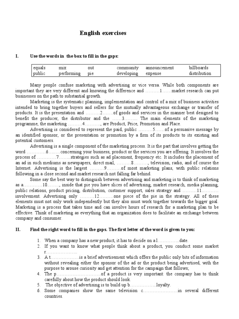 Many people confuse marketing with advertising or vice versa. While both components are important they are very different and knowing the difference and 1market research can put businesses on the path to substantial growth. Marketing is the systematic planning, implementation and control of a mix of business activities intended to bring together buyers and sellers for the mutually advantageous exchange or transfer of products. It is the presentation and 2.of goods and services in the manner best designed to benefit the producer, the distributor and the 3... The main elements of the marketing programme, the marketing 4., are Product, Price, Promotion and Place. Advertising is considered to represent the paid, public 5of a persuasive message by an identified sponsor, or the presentation or promotion by a firm of its products to its existing and potential customers. Advertising is a single component of the marketing process. It is the part that involves getting the word 6..concerning your business, product or the services you are offering. It involves the process of 7..strategies such as ad placement, frequency etc. It includes the placement of an ad in such mediums as newspapers, direct mail, 8, television, radio, and of course the Internet. Advertising is the largest 9of most marketing plans, with public relations following in a close second and market research not falling far behind. Some say the best way to distinguish between advertising and marketing is to think of marketing as a10.., inside that pie you have slices of advertising, market research, media planning, public relations, product pricing, distribution, customer support, sales strategy and 11.. involvement. Advertising only 12one piece of the pie in the strategy. All of these elements must not only work independently but they also must work together towards the bigger goal. Marketing is a process that takes time and can involve hours of research for a marketing plan to be effective. Think of marketing as everything that an organization does to facilitate an exchange between company and consumer. II. Find the right word to fill in the gaps. The first letter of the word is given to you: 1. When a company has a new product, it has to decide on a l..date. 2. If you want to know what people think about a product, you conduct some market r.. 3. A tis a brief advertisement which offers the public only bits of information without revealing either the sponsor of the ad or the product being advertised, with the purpose to arouse curiosity and get attention for the campaign that follows; 4. The p.of a product is very important: the company has to think carefully about how the product should look. 5. The objective of advertising is to build up b..loyalty. 6. Some companies show the same television c.in several different countries.