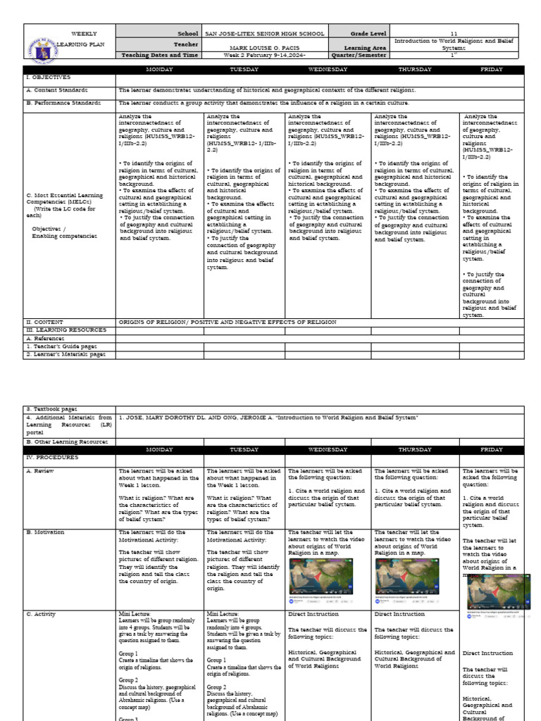 WEEKLY School SAN JOSE-LITEX SENIOR HIGH SCHOOL Grade Level 11