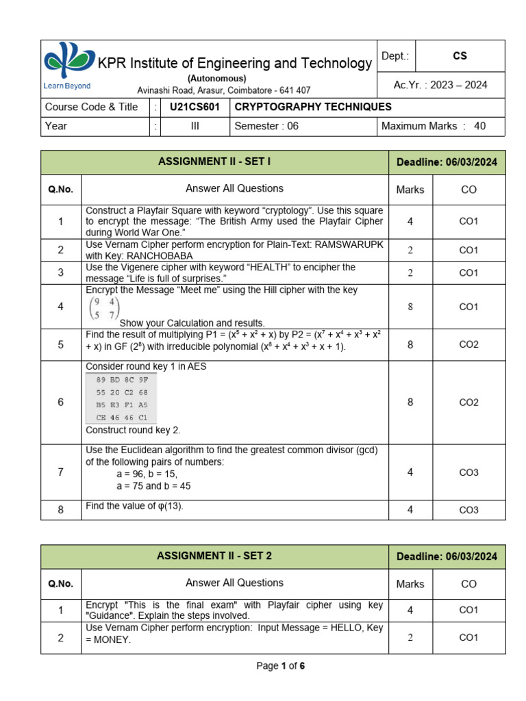 Course Code & Title : U21CS601 CRYPTOGRAPHY TECHNIQUES