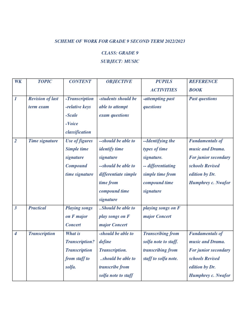 SCHEME OF WORK FOR GRADE 9 SECOND TERM 2022/2023
