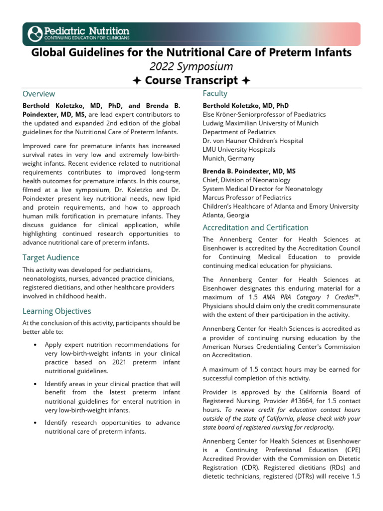 health outcomes for premature infants. In this course, Chief, Division of Neonatology