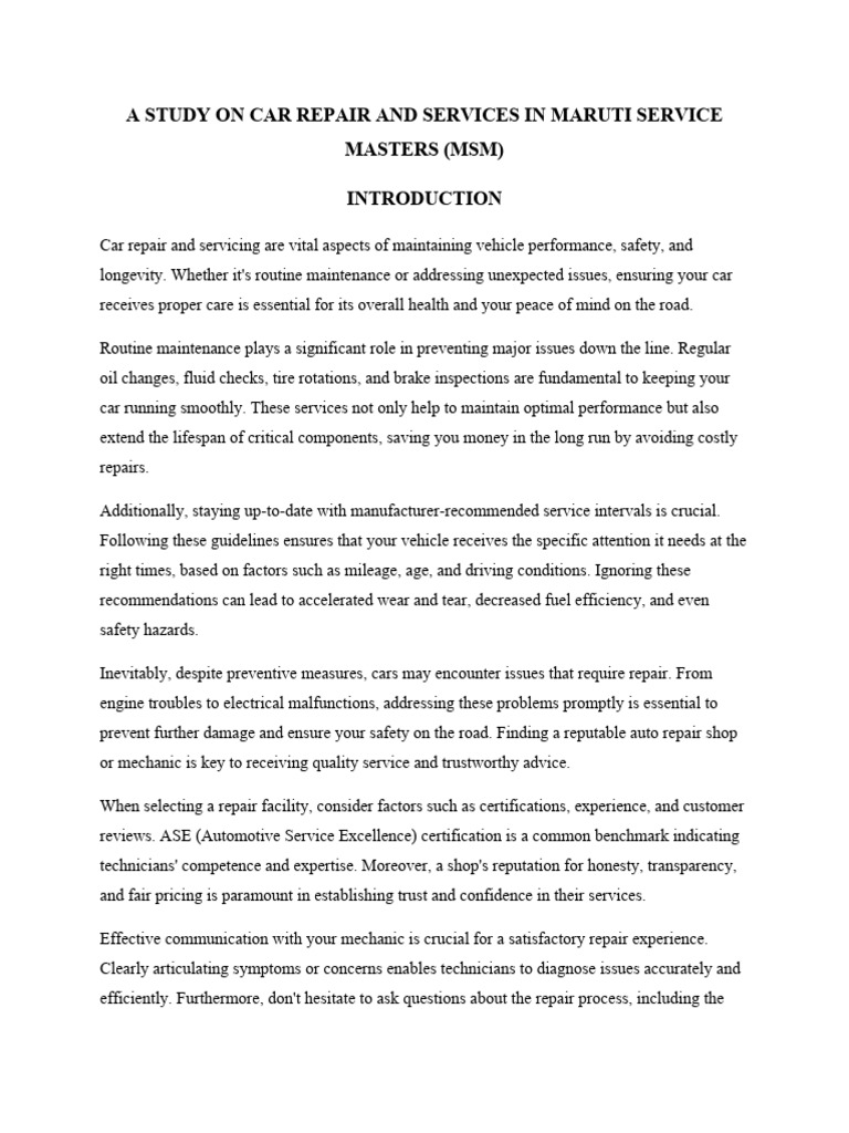 A STUDY ON CAR REPAIR AND SERVICES IN MARUTI SERVICE
