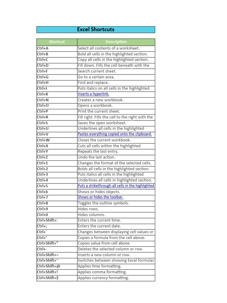 Ctrl+5 Puts a strikethrough all cells in the highlighted section.
