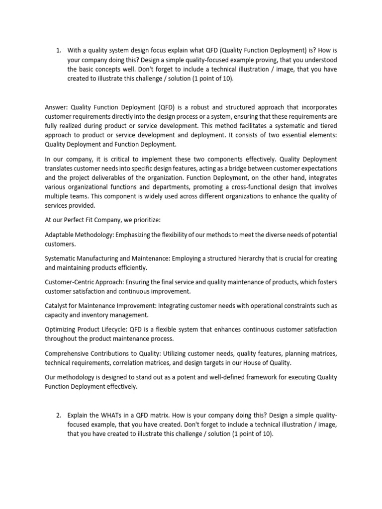 1. With a quality system design focus explain what QFD (Quality Function Deployment) is?